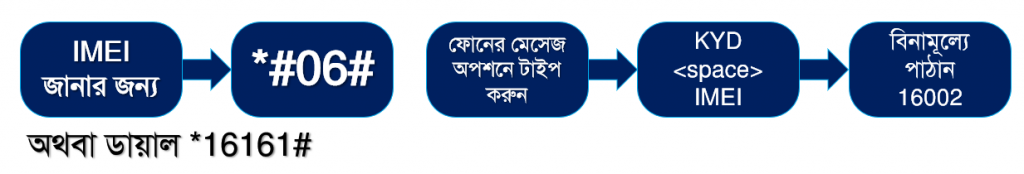 ধাপ-১: মোবাইল ফোনের মেসেজ অপশনে গিয়ে KYD১৫ ডিজিটের IMEI নম্বরটি লিখুন। উদাহরণ স্বরূপ: KYD 123456789012345